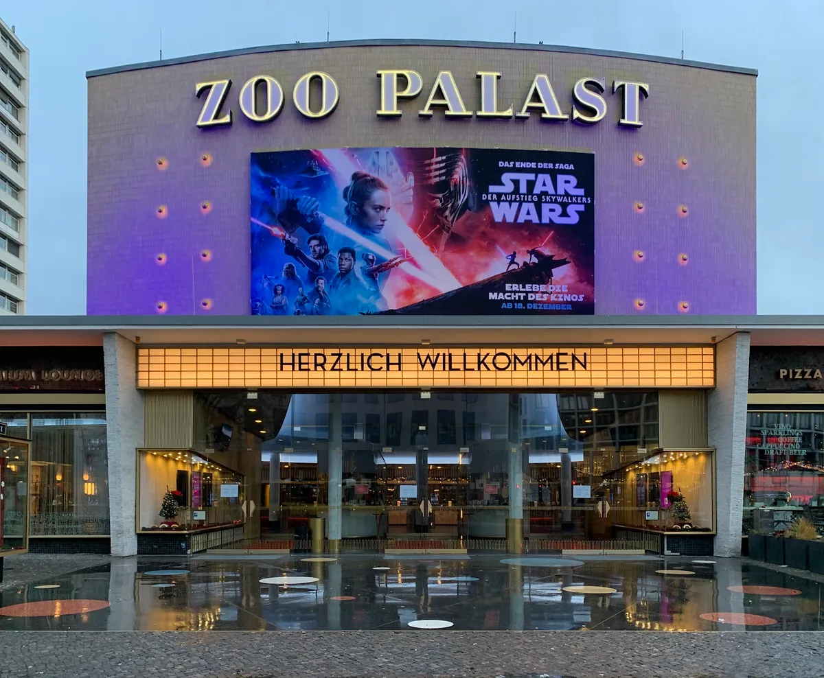 The Zoo Palast is West Berlin's most iconic cinema, a listed building whose history reaches back to 1915 when the first picture house opened at this Hardenbergstrasse address. The present structure, inaugurated in 1957, served as the main Berlinale competition venue until 1999, hosting four decades of festival glamour at the heart of the city's western centre. After closing in 2010, it was comprehensively renovated and reopened in November 2013 with seven screens, roughly 1,650 wide leather seats, Dolby Atmos sound, and 70mm analog projection capability. Two of its auditoriums are heritage-protected, and every screening begins with a signature light and water show. The Zoo Palast does not merely show films -- it stages them, with a grandeur that recalls the age when going to the cinema was an event unto itself.